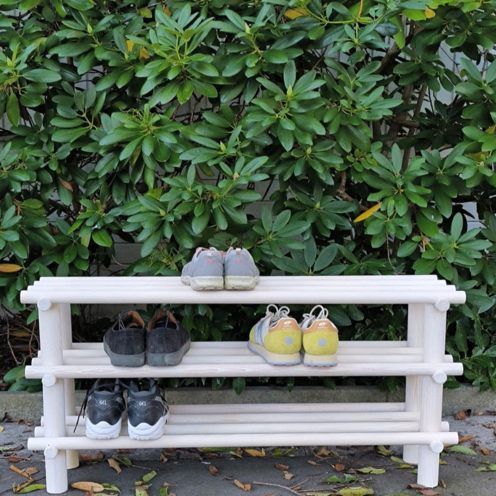 En skohylla som man bygger våning för våning till den nivå så att alla skor får plats.