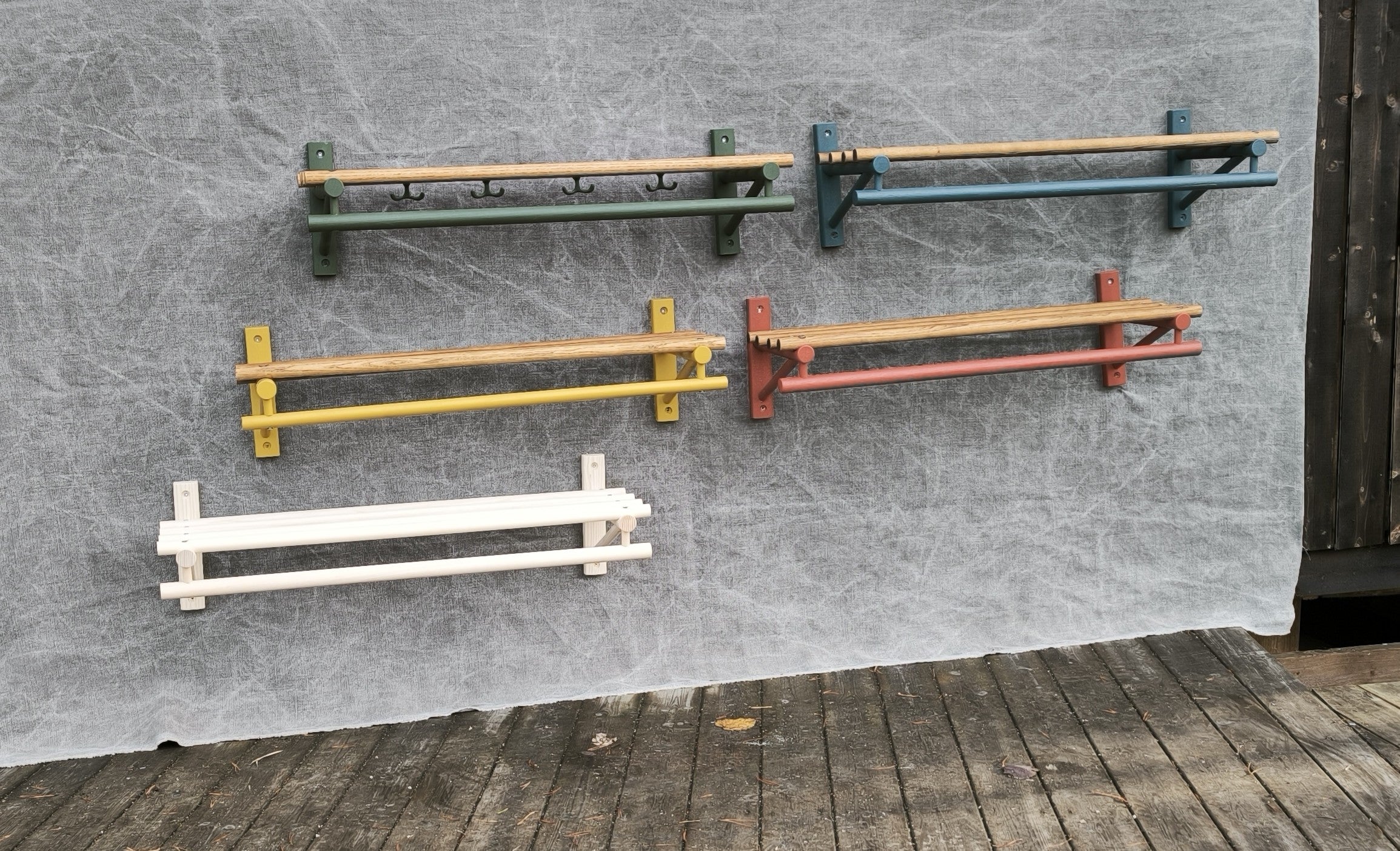 Props designprogram för en välkomnande hall. Funktionellt och tilltalande präglat av form, färg och trä. Hatt-och skohyllor, kroklister, speglar och sittbänkar utfört med kvalité och rejält hantverk för ett långt liv. Tillverkas av träslaget ask och med målade detaljer. Ritat i Sverige, tillverkat i Sverige.
