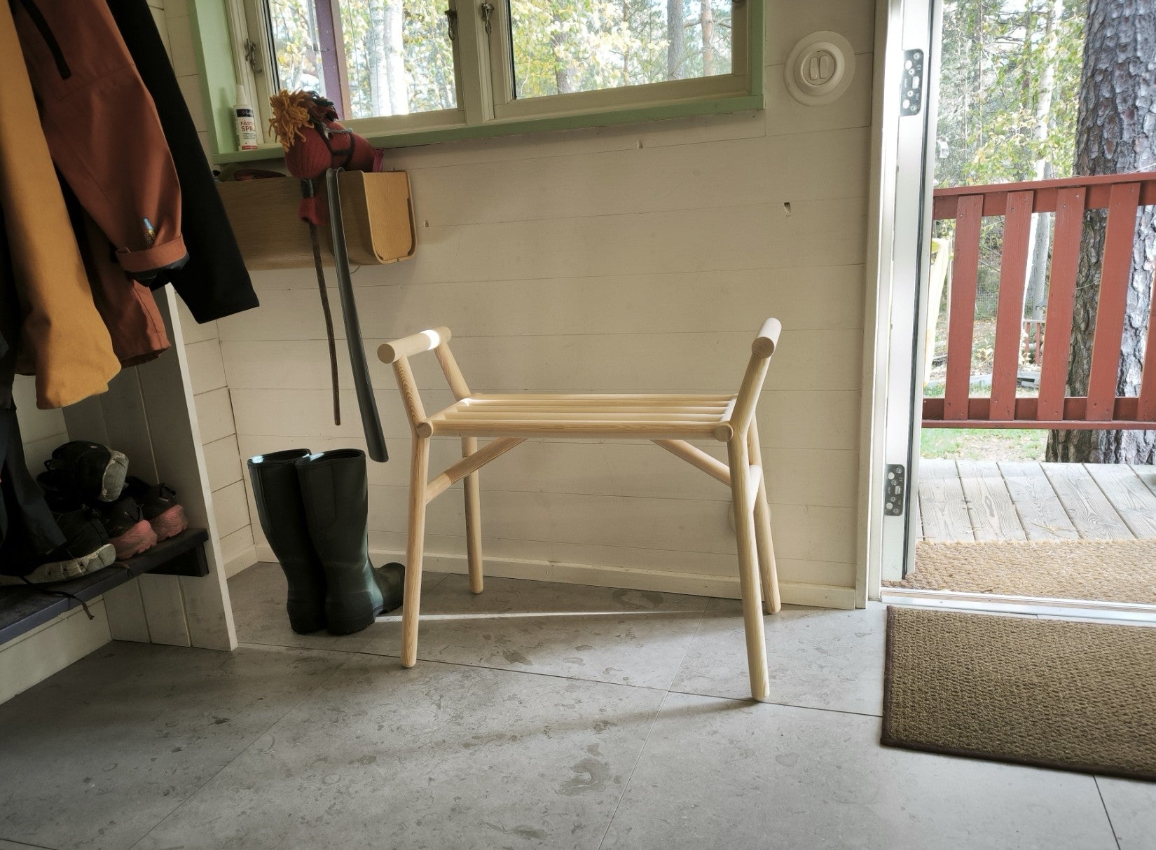 Props pall Gröndal är designad för att göra det enklare att ta på och av skor i hallen. Med ribbad sits och praktiska handtag kombinerar den funktion med luftig design.