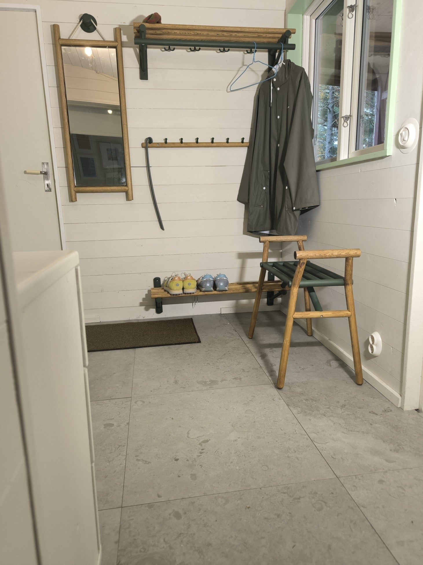 Vi letade ett ganska bra tag efter en skohylla man kan sätta på väggen, som samtidigt också kändes snyggt designad. Vi blev nöjda med Gröndal-hyllan :)
